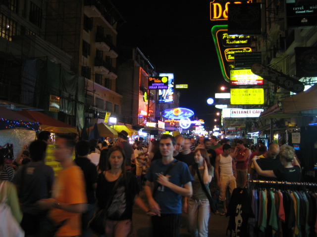 Ввиду постигшего кризиса, разочарования в жизни, развеивания детских мечт и прогрессирующей импотенции, большая часть мужской половины, собирающейся поехать в Таиланд, от этой затеи отказалась. Таким образом я оказался в компании 4-х клюшек неопределенного возраста и социального положения, но с неувядающим энтузезызмом в глазах. Тайские авиалинии откровенно порадовали Аэробусом, сервисом, персональным телевизором и меню с разносолами, а также не лимитированной выпивкой. По прилету одна наиболее энергичная Клюшка сказала, что ловить такси дешевле так же, как и у нас ( в зоне их приезда), и ломанувшись туда, тут же взяла две машины. В БангКоке заселились на КаусанРоад (местный Арбат) и у нас было пару дней до отлета на острова для знакомства с храмами и употребления местной еды. Периодически надоедал мелкий дождик, но сразу все высыхало..)) Ко второму дню очень захотелось надеть майку с налдписью на англ. и тайском: I don’t need fucking Tuk-Tuk, suits, massage, taxi-boat!
