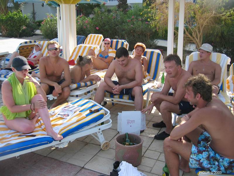 «А в Москве-то погода наладилась, а мы валим отсюда!»-размышлял я, смотря на сухой асфальт МКАДа, по которому такси несло меня в сторону Домодедово утром 2-го ноября. У стойки уже толпилась часть нашего авто.рушного народа, причем у нас с Горячевой оказались похожие прически, правда разных цветов)))) Народа должно было набраться 25 человек. Вспоминая майское прохождение паспортного контроля, я подумывал залепить ли пасть Студа скотчем сразу или немного погодя. «Что-то уж больно тихо проходит посадка!»,- философствовал я, затариваясь в Дьюти-Фри- «Не к добру!»)))) Это были последние два часа спокойствия и умиротворения за все путешествие)) Шоу началось через два часа после взлета)) Порядком «накачавшаяся» толпа авторушников нарушала безобразие хождением по салону, выпивульками и прочими вещами, пока одна из «Пайщиц-концессионерок» случайно не обнаружила своего мужа ( отставленного, но не вполне отпущенного), сидящего в задних рядах самолета со своей секретаршей, в то время, как он должен был оставаться в Москве))))) Надо сказать, что самолет уцелел и сел вполне благополучно, правда при этом пришлось пилотам вскрывать дверь туалета своим ключом, куда они уединились для выяснения отношений)Да и нам растащить девчонок, треснувших друг друга по разу))Еще Некс, нажравшийся и упавший поперек трех кресел, мешал нам при посадке))) Два автобуса привезли нас в Сафагу в «Холидей-Ин», где мы разложили на травке тех, кто уже не мог передвигаться, и пошли заселяться в номера))) На следующий же день мы поняли старую истину: «Все в природе уравновешено!» Если прошлую поездку Студ писал, что «Количество одиноких женщин по отношению к количеству мужчин скорее пугает, чем радует», то сейчас природа решила отыграться))) «Материала не было вообще!!!!» Даже Мите не пришлось почувствовать себя «Использованным»))) Все дни мы занимались спортом в виде ныряния, серфа, водного поло, а так же опустошали забитые напитками холодильники. На 3-ий день один из членов «экспедиции» заметил одинокую студентку лет 18 с мамашей))) То, что шансов не было никаких, стало понятно позже, когда мамаша встала грудью на «защиту ребенка от разнузданных авто.рушников»)))) «Вы очень плохое впечатление произвели на маму!»-рассказывала студентка—«мы приехали на час позже вас. Мама была расстроена перелетом, отелем, жарой, и.т.д. И только мы вошли в номер и выглянули с балкона, как увидели три тела, валяющиеся вдрызг пьяные на траве, а снизу раздавался отборный русский мат)))» Другой член экспедиции решил изменить тактику и начать с мамаши (другой , естественно) с 11-летней дочкой))) Психология детей –вещь темная))) Дочка не отпускала мамашу ни на шаг и ревностно обрывала все поползновения.))) Так же была обнаружена одинокая дайверша, которая нажиралась в хлам каждый вечер)) «Один из наших» таки затащил ее к себе среди дня, когда понял, что вечером это делать бесполезно, т.к. тело становилось бездыханным сразу после ужина)))))Практически это был единственный случай за всю неделю на 25 человек девчонок и мальчишек)))))Гыы Так же мы нанимали несколько раз яхту к рифам и на рыбалку, где были пойманы две рыбины неизвестной породы, с которыми каждый счел долгом сфоткаться))) Особо заслуживает описания пристрастие половины путешественников к карточным играм))) Игры в преф продолжались до 3-х ночи (даже забивалось на пус