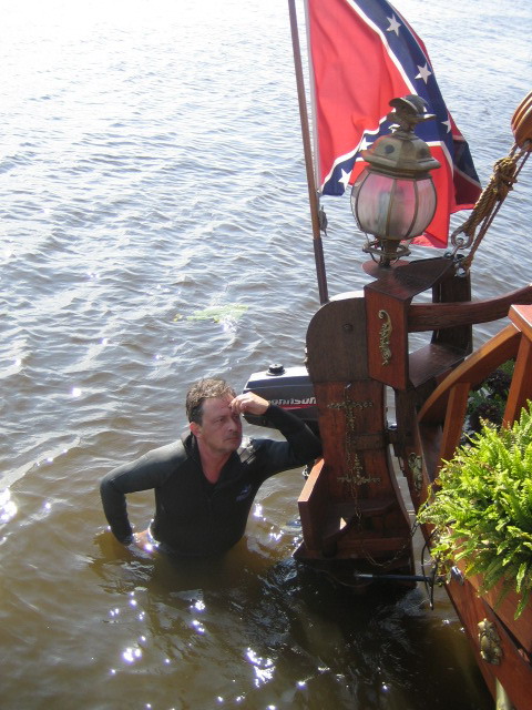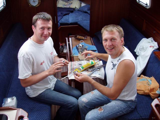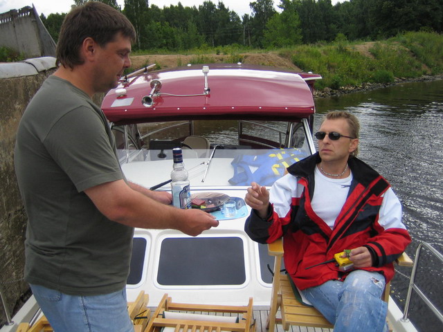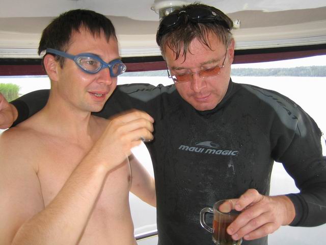 Утром местное население в лице Олега проявило самоотверженность и помогло снять сети. Он одел гидрокостюм и довольно долго нырял с ножом, а юнгу к нему в помощь мы попросту спихнули багром, причем юнга отчаянно сопротивлялся, правда водки потом употребил двойное количество, под предлогом «Согрева». В воскресенье утром мы уже отбыли в сторону Москвы (до которой еще было два дня хода), увозя самые сладостные впечатления и разбитое сердце юнги))))))Гыыыы |