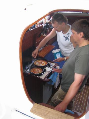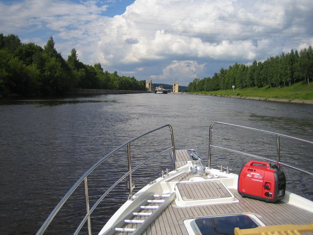 Кок Алексей немедленно начал приготовление завтрака в виде яичницы с беконом и помидорами. Он был несказанно счастлив, ибо ему выделили персональную каюту, рядом с двигателем, которую он называл «норой», и отличить его храп от шума дизеля порой не представлялось возможным.)) Идя вверх по течению, мы вышли в Иваньковское водохранилище, и эффект морского путешествия из-за ветра и волн стал полным. “Christy” это было совершенно пофигу и она резала волны, практически их не замечая.